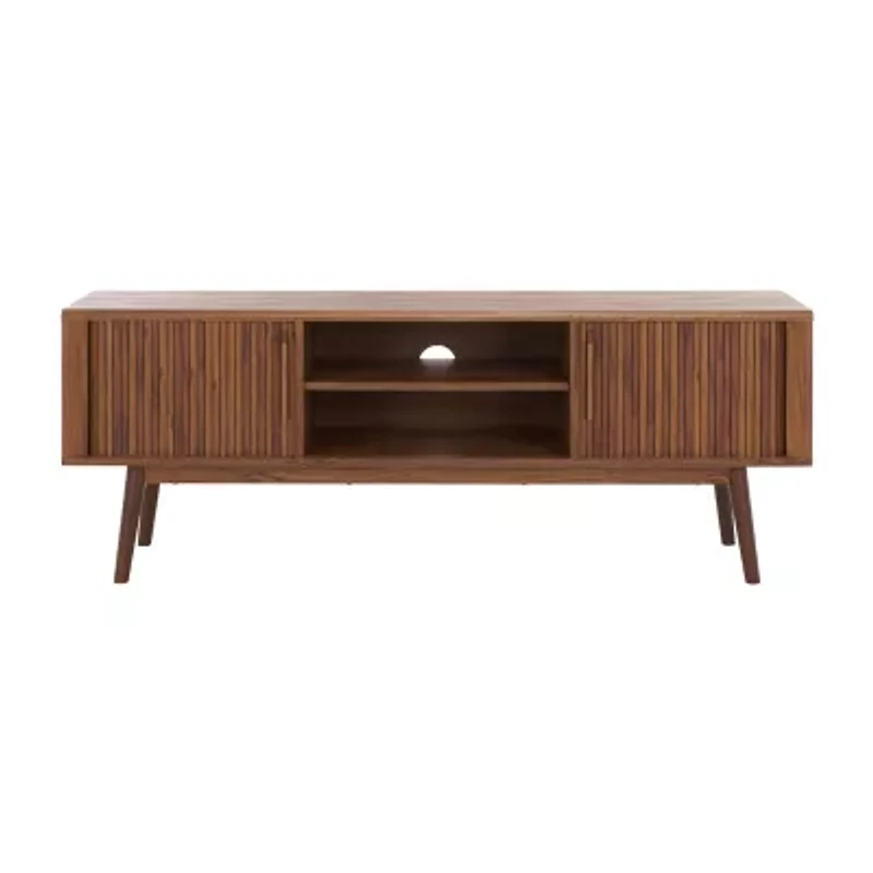 Organize your home with our sophisticated and highly functional Aphra media stand. It showcases the timelessness of mid-century design in a thoughtfully detailed and streamlined design. The clean and linear profile of the media unit is perched upon tapered legs. It showcases rich grains of wood in a rich finish to attain a versatile and charming appeal. The tambour sliding doors add definition and dynamic functionality to our media stand. Featuring adjustable shelves and rear cut-outs, the storage unit is sure to keep all your media essentials organized.