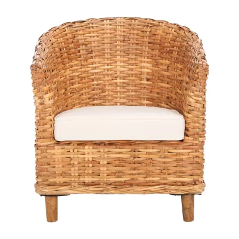 Surround yourself with the comfort and transitional style of the omni barrel chair. Crafted of mango wood and natural toned woven rattan with poly cotton cushion, it’s the perfect place to dream the day away.