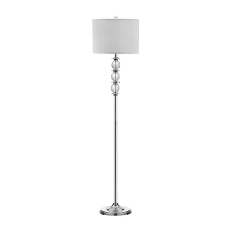 Tiny flourishes make a big impact in the Riga Floor Lamp. Clear crystal orbs and delicately bowed caps and collars transform Riga into an elegant scene stealer. Shiny chrome base and a drum shade topper keep the look fresh and contemporary. Bring artistic dimension to home furnishings with this ideal accent piece that complements and blends perfectly with any home decor. This is a great addition to your home whether in the countryside or busy city.