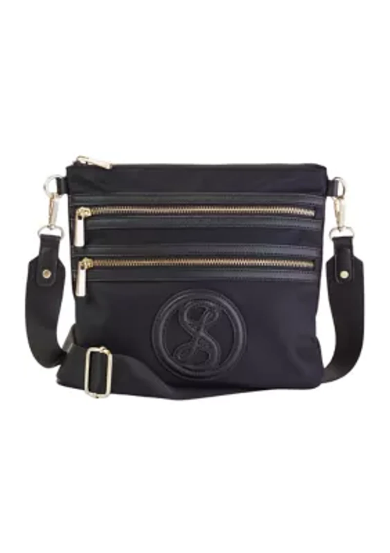 Trimmed in saffiano leather, this double zip crossbody from Sam & Libby features a lightly structured silhouette that you'll love to carry. Zip closure 15'- 23' drop Crossbody strap with 15" - 23" drop Exterior: 2 front zip pockets, chain shoulder, saffiano embossed logo patch, metal logo plack Interior: back wall zip pocket, 2 front wall slip pockets Imported Product Specifications 9" L x 10" W x 1.5" D Material & Care Nylon Wipe clean