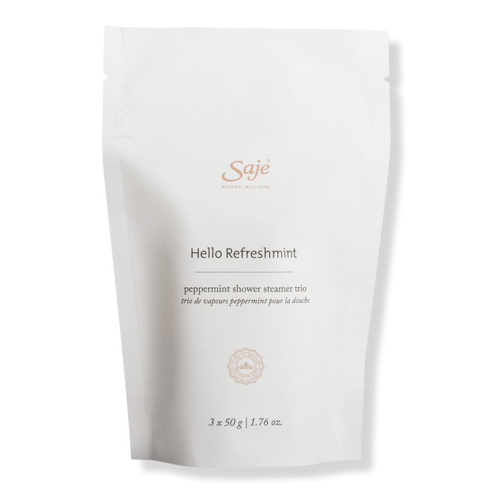 SHOWER STEAMER TRIO HELLO REFRESHMENT. Benefits: A blend of Peppermint, Eucalyptus and Rosemary essential oils offers a plant-powered pick-me-up while you shower.. Powered by patent-pending aroma-boosting menthol crystals that help amplify the essential oils effects.. Made with 100% nature-derived ingredients. No artificial colors, dyes or fragrances.. Most natural steamers dissolve after one shower. Saje's work double the time, lasting up to two.. Scent Type: Minty: Sharp Rosemary and herbal Eucalyptus mingle with the invigorating freshness of Peppermint.. Key Ingredients: Peppermint helps revive depleted energy.*. Eucalyptus encourages deep, clear breathing.. Rosemary stimulates the senses.. *This statement hasnt been evaluated by the Food and Drug Administration. This product is not used to treat, cure or prevent any disease..
