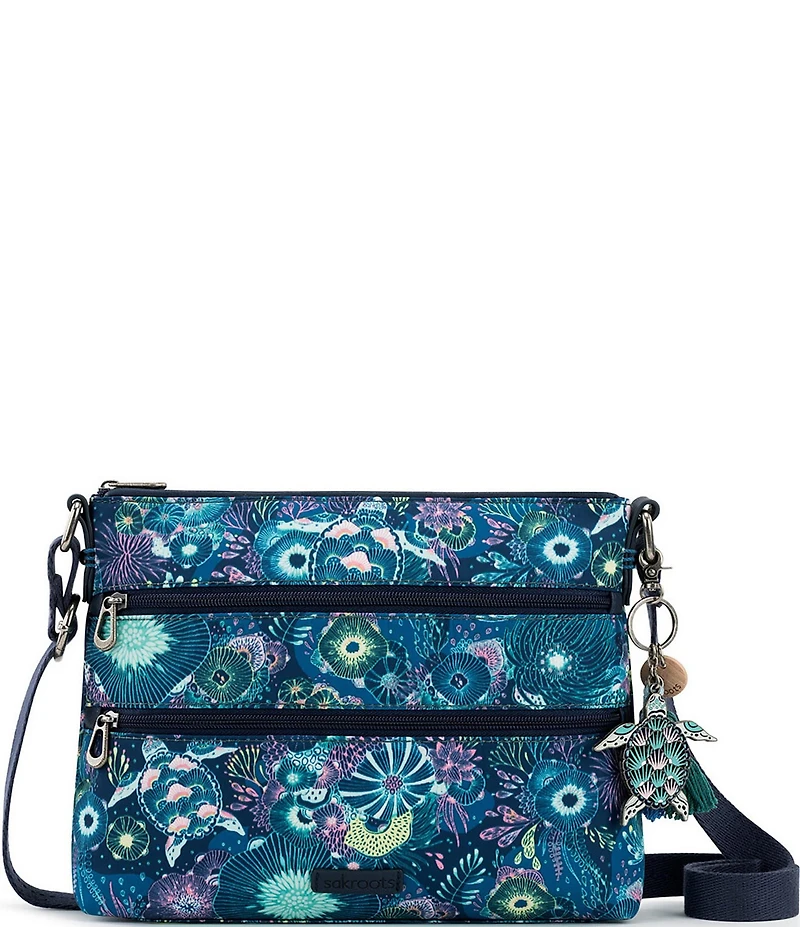 From Sakroots, the Basic Zip Top Royal Blue Seascape Crossbody Bag features: Polyester twill Antique silver hardware Polyester lining Zip closure Adjustable webbing strap Two multifunction pockets and one zip pocket inside Two zip pockets and one back zip pocket outside Durable, water repellent, and stain resistant Critter keychain Approx. 12.25" L x 2.75" W x 9" H bag; 23" strap drop Imported.