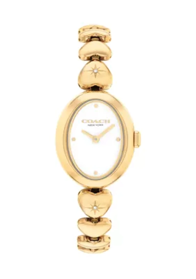 Designed with a modern minimalist sensibility, the Sammy is a refined timepiece perfect for everyday. Finished with a playfully romantic heart-link bracelet detailed with delicate crystals for a hint of sparkle, this stainless steel watch features a white lacquer dial with polished dome markers. It secures with a Coach Signature clasp closure.# Stainless steel case and bracelet Approx. case diameter: 22mm Mineral crystal Quartz movement Foldover clasp closure Water-resistant to 99 feet 2-year full replacement warranty Imported Material & Care Stainless steel Spot clean only