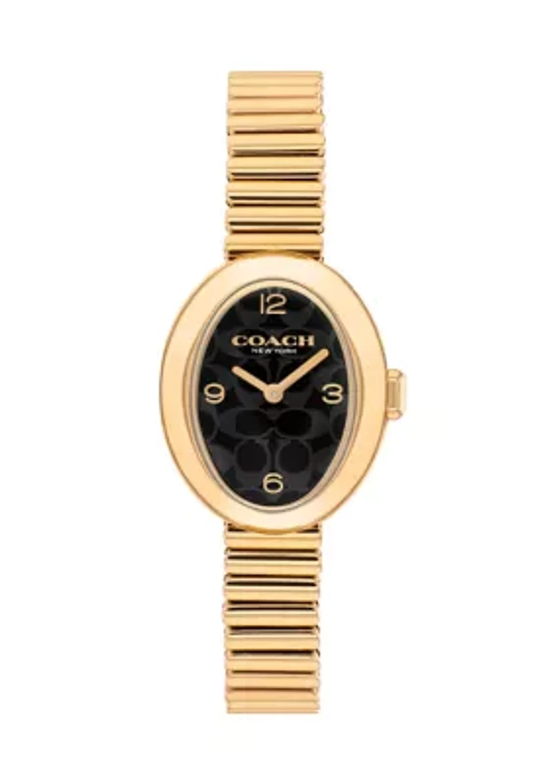 Designed with a modern minimalist sensibility, the Sammy from COACH is a refined timepiece perfect for everyday. Finished with a sleek stretch bracelet for a comfortable fit, the watch features a lacquer Coach Signature dial detailed with numeral markers Stretch bracelet Approx. case diameter: 22mm Mineral crystal Quartz movement Slip on Water-resistant to 99 feet Polished finish Full replacement 2 year warranty available Imported Product Specifications 7" L Material & Care Gold and silver tone metal Clean with a soft cloth