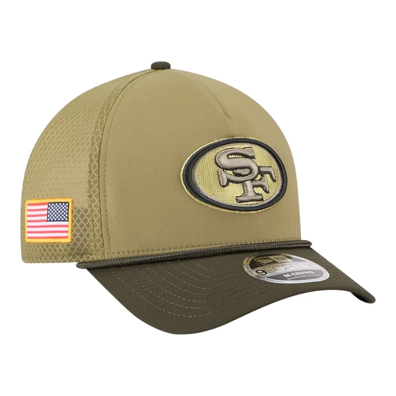 NFL Salute to ServiceSalute to Service is a year-round effort to Honor, Empower, and Connect our nation's service members, veterans, and their families. Every year during the NFL’s Salute to Service campaign, players, coaches, and staff don military-inspired apparel to honor U.S. military members. New Era 9FORTY M-Crown A-Frame HatM-Crown A-Frame build – taller, squared front crown shape for a modern look Curved visorUSA flag on the side Adjustable snapback closure for a comfortable fit9FORTY silhouette – structured crown with a contoured front panelDetailed embroidery of team logoPay your respects to those who serve, have served, and did serve in our military and also represent your favorite NFL team in this San Francisco 49ers Green 2025 NFL Salute to Service Collection New Era 9FORTY A-Frame M-Crown Adjustable Hat.