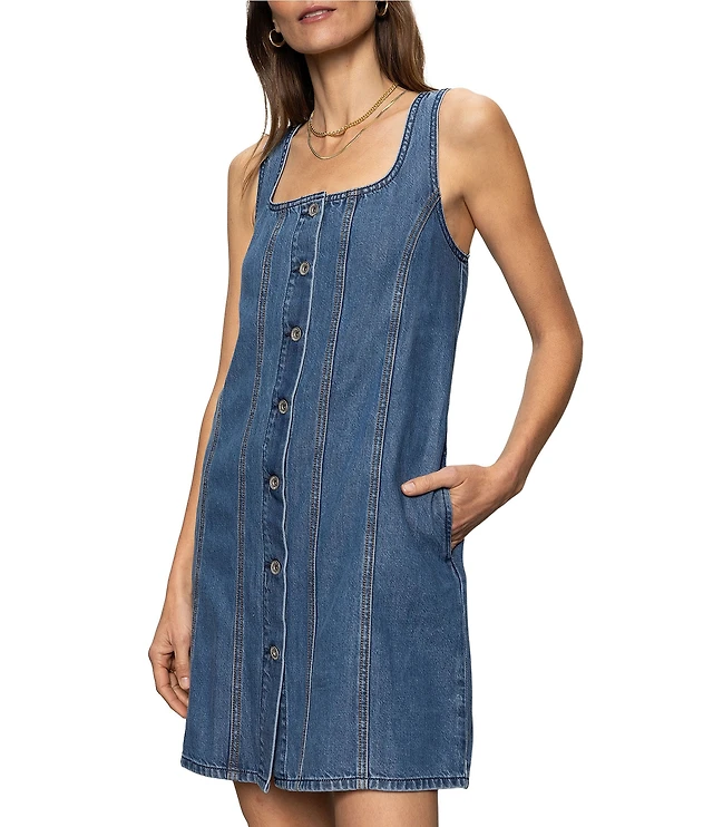 Stretch Denim Square Neck Sleeveless Button Front Dress