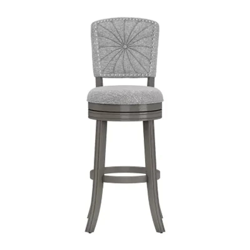 The Hillsdale furniture Santa Clara ll bar stool is the essence of glamorous sophistication. Tapered legs and a center button tufting outlined with silver nail head studding on the stool back combine to create a fresh take on traditional design. The overall result is both modern and regal -- the perfect complement to formal and upscale décor. The antique gray finish and ash gray upholstery make the swivel stool modest yet deluxe. Adds luxury to your kitchen and dining room or bar area.