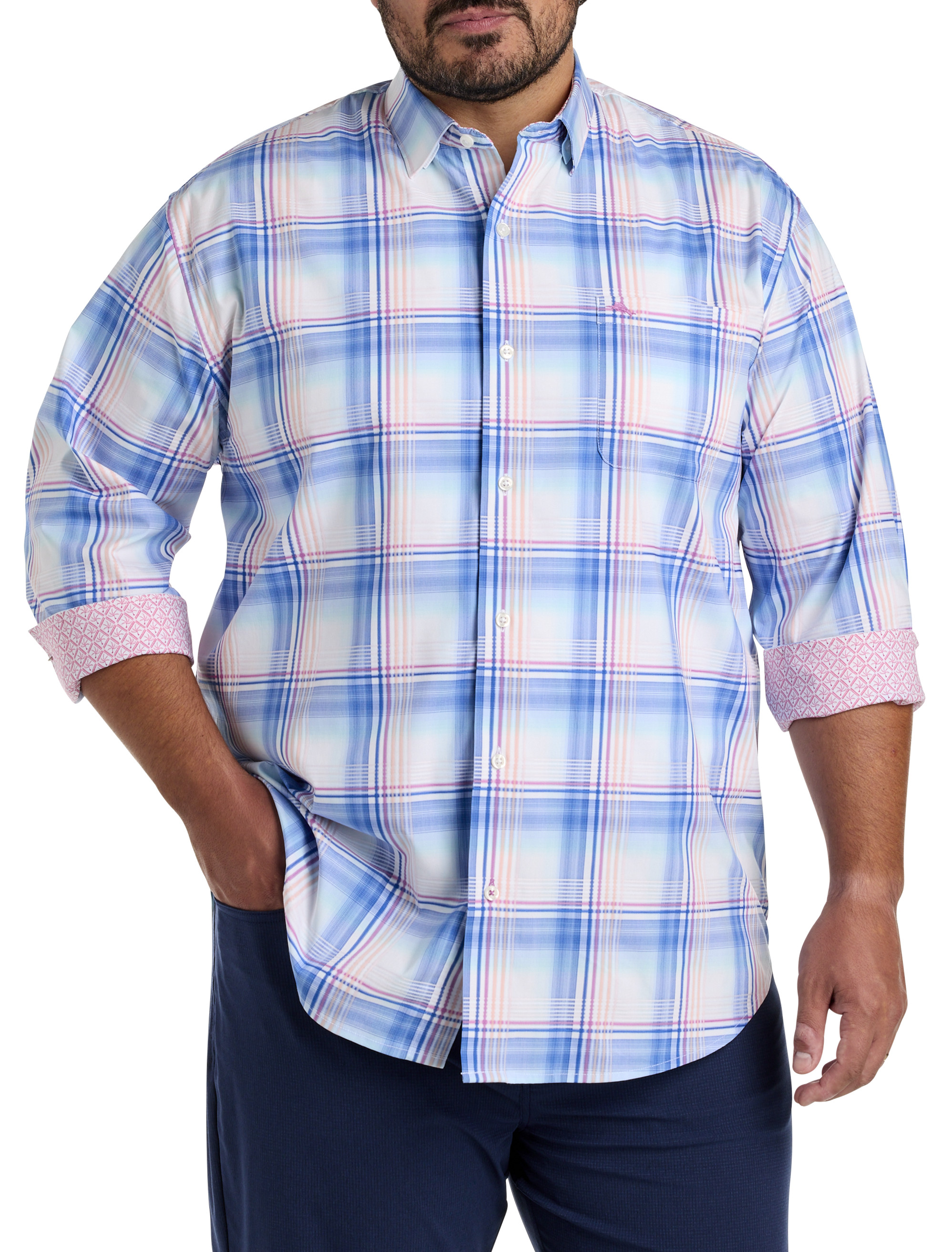 A stylish choice for casual wear, this check sport shirt from Tommy Bahama is a staple for your wardrobe. Pair it with jeans on the weekends or chinos for casual Fridays at the office. Crafted in a sustainable cotton blend with COOLMAX® EcoMade polyester to help keep you cool and comfortable, it allows for the freedom to move without restriction and is a confident look that you'll want to add to your Tommy Bahama collection. Roll up the sleeves and check out the contrasting print pattern at the inside cuffs, too!
