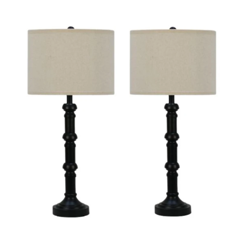 Featuring sturdy black bases with finely detailed column designs, these Satin Black Stacked Column Table Lamps bring a refined touch to any space! They blend seamlessly into both traditional and contemporary settings. Set includes two (2) lamps Each lamp measures 30.75H in. Crafted of metal Satin black finish Stacked column body Hardback round drum shades in oatmeal linen cotton Shades measure 10H x 13.5 in. in diameter Sockets accommodate 150-watt, Type A19 bulbs Switch type: 3-way Includes black, 60 in. plug-in cord Weight: 5 lbs. each UL and CSA listed Care: Dust with a soft, dry cloth. Do not exceed specified wattage. This item is available at Kirklands.com only, not available in stores. Please note: this item cannot be shipped to APO/FPO addresses.