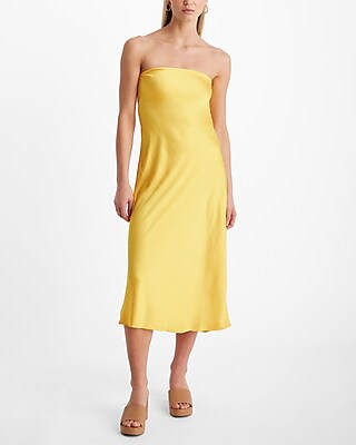 This strapless slip dress gives you all that you're looking for with the lined satin fabric, straight hem and midi length.