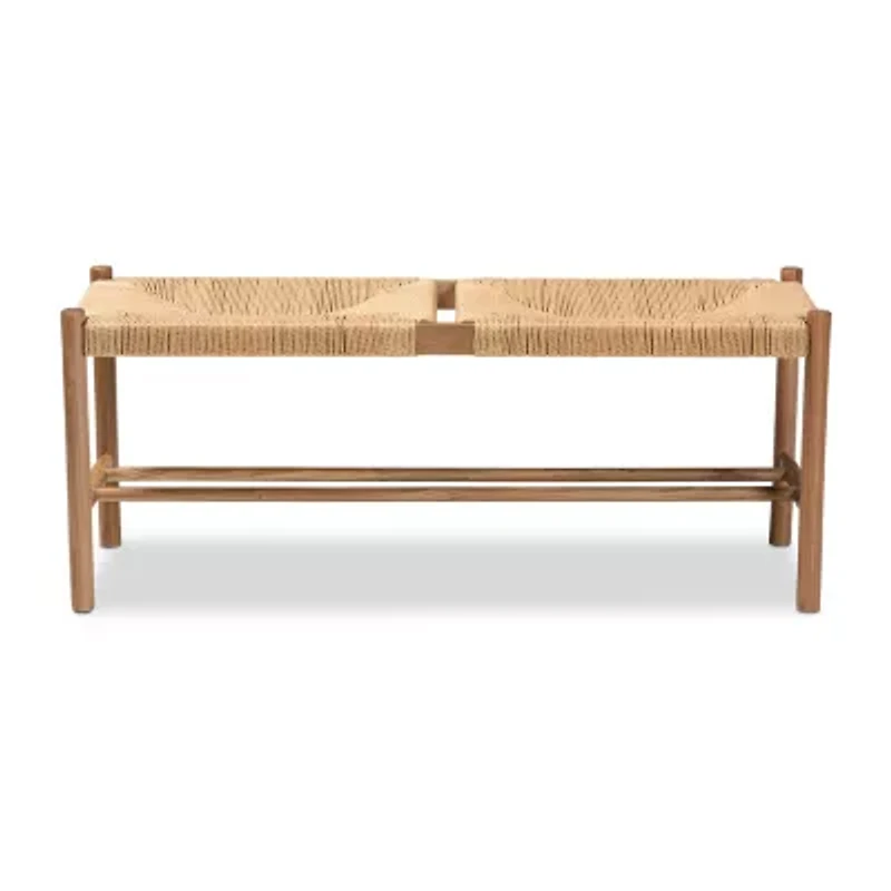 Generate an atmosphere of warmth in your space with the natural charm of the Saura dining bench. Made in China, this bench is comprised of a sturdy wood frame upholstered in paper hemp yarn. The seats feature a meticulous woven design to create smooth, comfortable seating for every meal. Requiring assembly, the Saura features a slatted wood shelf underneath the seat for convenient on-hand storage. A lovely display that exudes rustic personality, the Saura dining bench elevates any occasion. Overall dimensions: 17.70" high x 43.30" wide x 13.80" deep; seating area dimensions: 43.30" wide x14.00" deep x15.30" high; legs: 17.80" high;