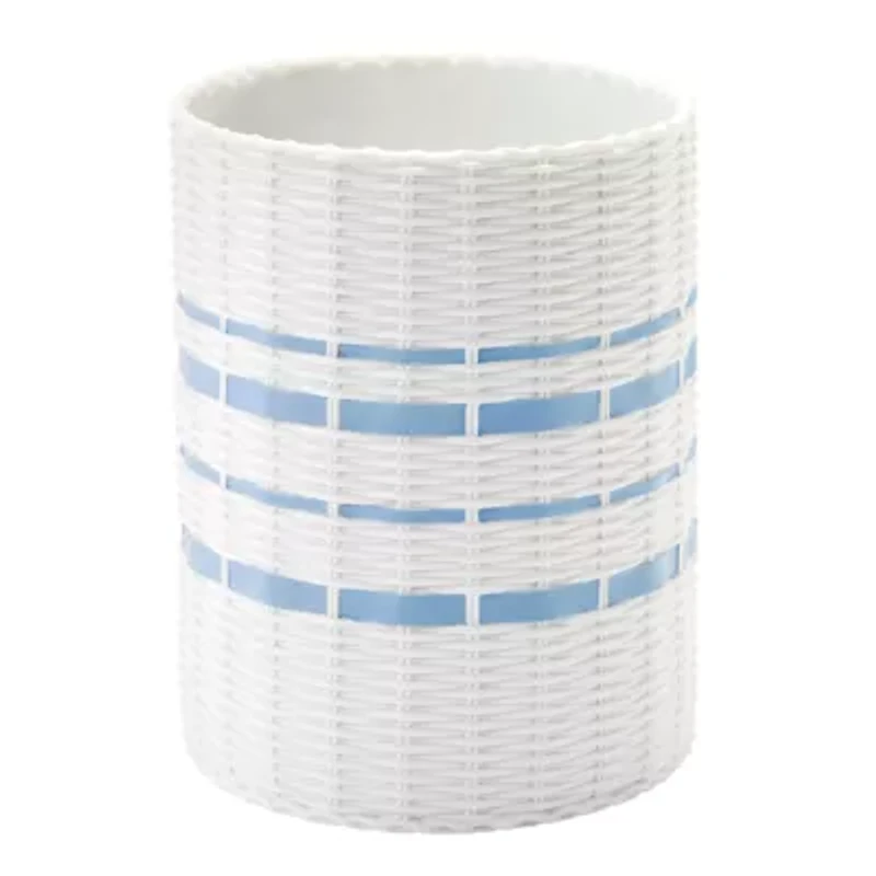 Elevate your bathroom decor with The Izod Savannah Decorative Wastebasket featuring woven white colored wicker design with medium blue horizontal stripes. The detailed finish gives it the appearance of real wicker crafted in durable, hand-painted resin, offering a long lasting performance. Imported Product Specifications 8.00-in. x 8.00-in. x 10.00-in. Material & Care Resin Wipe clean