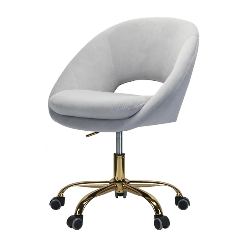 Upgrade your workspace with this Savas Gray Velvet Office Chair! This chair features a sleek, open-back design upholstered in soft light gray fabric, offering plush support and a breathable seating experience. Chair measures 24W x 23.5D x 32.5H in. Crafted with a wood and metal frame Upholstered in gray velvet and filled with high-density foam Gold metal base finish Features an open backrest Adjustable height up to 35.5 inches Seat measures 17W x 18D x 18-21H in. Weight: 16 lbs. Weight capacity: 250 lbs. Assembly required Not intended for commercial use Care: Spot clean. This item is available at Kirklands.com only, not available in stores. Please note: this item cannot be shipped to APO/FPO addresses.