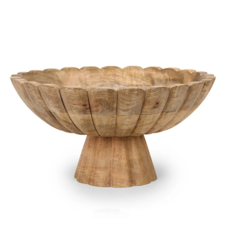 Our Scalloped Mango Wood Bowl serves as a beautiful stage to showcase orbs and potpourri - or functions as a convenient catch all! Its pedestal base provides an extra lift, adding height and texture to any table display. Bowl measures 6.5H x 12 in. in diameter Crafted of mango wood Natural wood grain finish Scalloped edge Pedestal base For decorative use only Care: Dust with a soft, dry cloth. Contact your local Kirkland's store for availability. Quantities and selection may vary by location. WARNING: Cancer and Reproductive Harm - For more information go to www.P65Warnings.ca.gov .