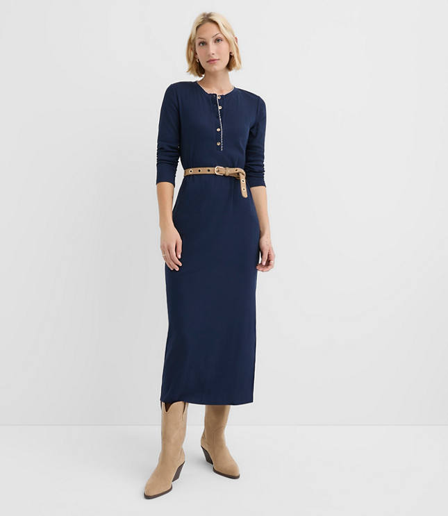 With a scalloped neck and ribbed stitch, this soft cotton blend henley midi is a cool, comfy and understated necessity. Crew neck Long sleeves Henley button front. Side slit, Imported:, Fit: Shift - fits straight and relaxed, Length: 49 3/4"from center back neck to hem, measured from a size 8 / M, Fabrication: 95% Cotton 5 Spandex, Garment Care: Machine Washable Loft Scalloped Ribbed Henley Midi Dress Size XS Deep Space Blue Women's by Loft Size Regular - XS Deep Space Blue Women's Shift, Dresses Everyday 95% Cotton 5% Spandex Machine Washable