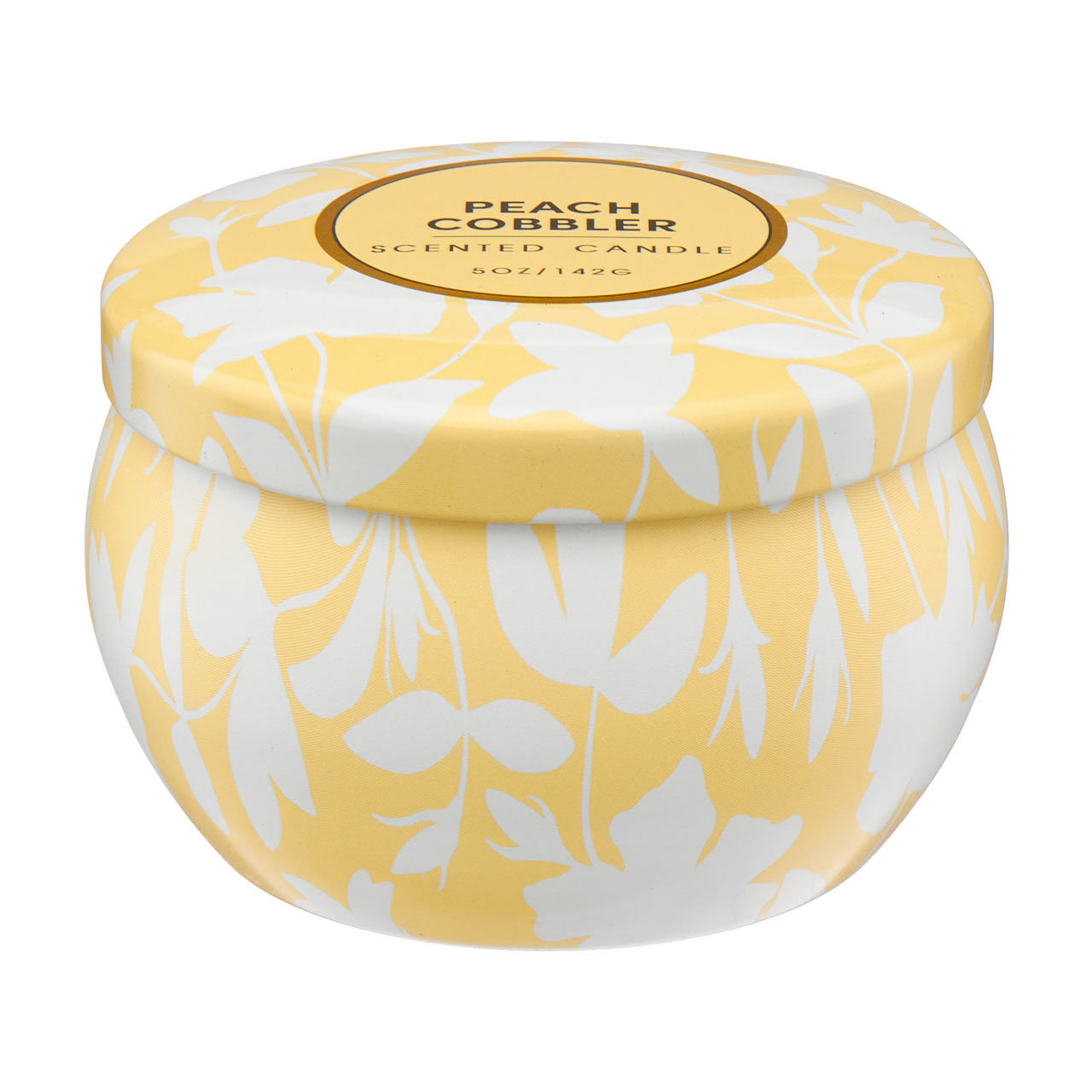 - 5 oz candle in a stylish yellow floral-patterned tin