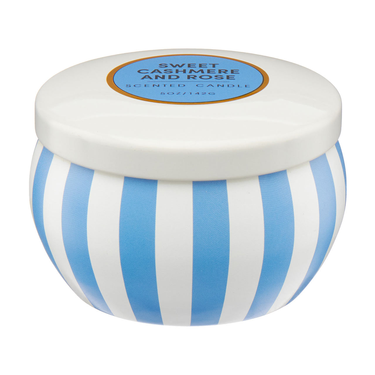 Housed in an elegantly designed container with blue and white stripes, this candle not only provides a delightful fragrance but also adds a touch of charm to your decor. The compact size makes it ideal for placing on bedside tables, bathroom counters, or any space needing a touch of elegance and calm.