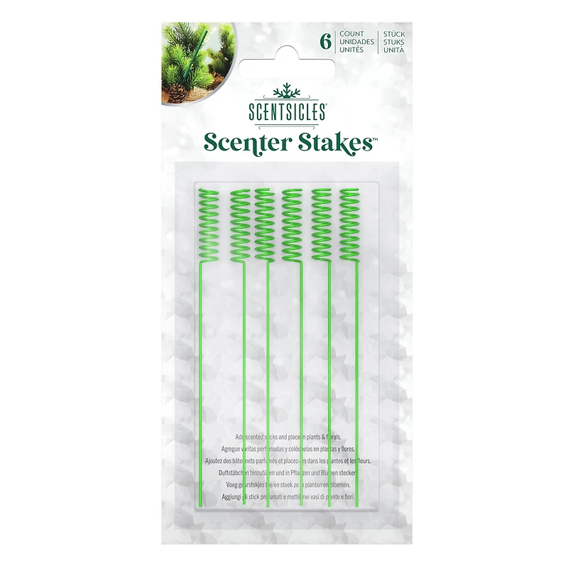 Scenter Stakes provide an easy way to place Scentsicles scented ornament sticks in a variety of new hiding spots, including live and faux plants, bouquets and arrangements. Simply secure a scented stick in the swirled end of the Scenter Stake, and then push the stake into arrangements (eg. faux floral foam), dirt in potted plants, or into the water of a floral bouquet. You can even use Scenter Stakes as a pick for trees, wreaths and garland. Ensure that the scented stick isn't touching any live petals and that there's plenty of air space around it. Enjoy the scent for 30 days or more, recycle the used scented stick and refill the Scenter Stake with a fresh one. Details:Green6 Scenter StakesPlace in faux, dried or live plants, floral bouquets and seasonal arrangementsReusableMade of durable metalScentsicle Ornament Sticks sold separately