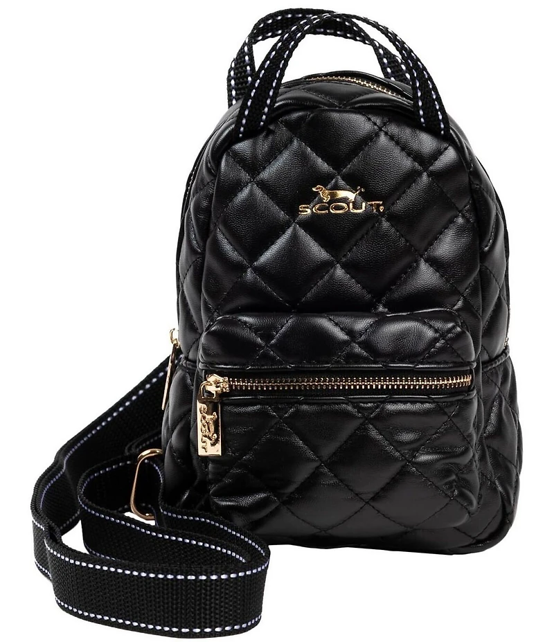 From SCOUT, this mini backpack features: Mini backpack Quilted fabric Interior slip pocket Four metal D-rings on exterior for attaching straps to configure as crossbody, sling bag, fanny pack, or backpack Exterior zipper pocket on front Zipper closure Top handle for quick grab-and-go Approx. 1.5" handle drop Two adjustable, detachable straps Approx. 5" L x 7" H x 2.5" W Spot clean Imported.