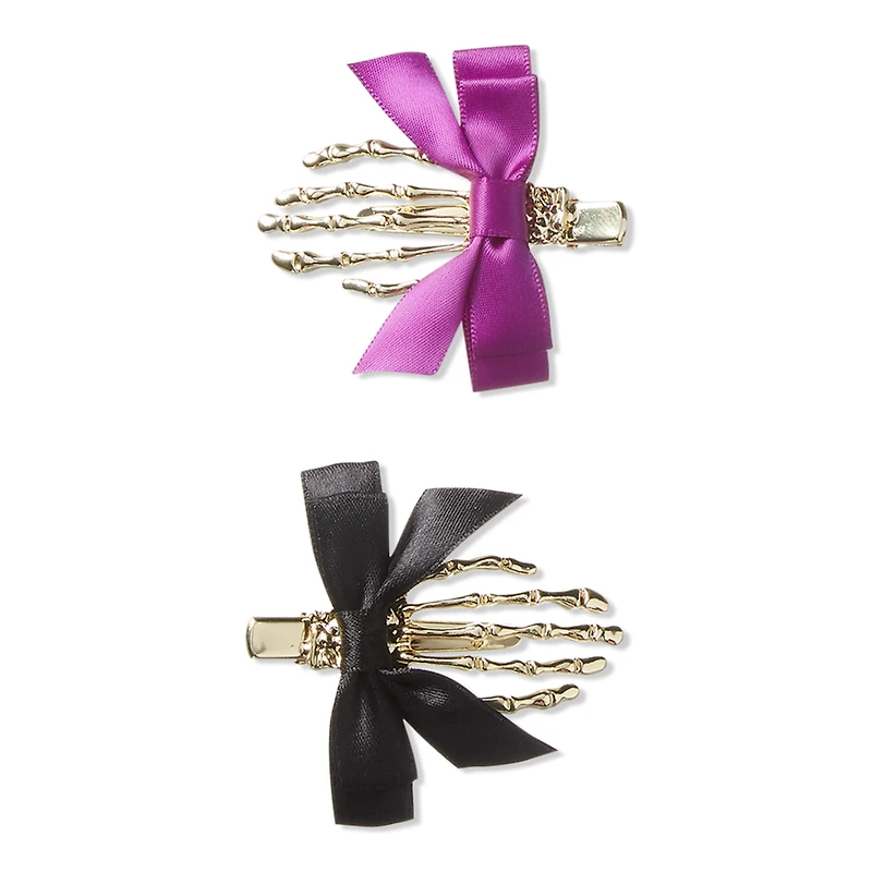 HALLOWEEN SALON CLIPS 2PK. Features: One purple hair clip features a purple bow, the other a black bow. Perfect for side parts and updos. Secure yet comfortable hold. : :