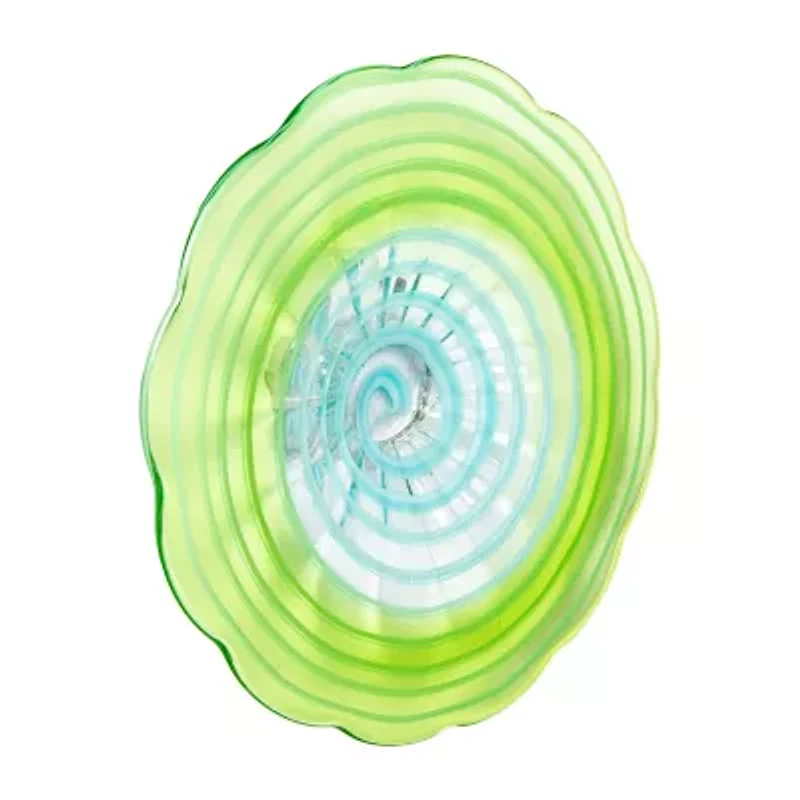 Our Favrile Art Glass Collection Wall Art offers you a unique decorating opportunity that is easily incorporated into any decor style. Each includes a hanging bracket for wall use, but these stunners are not limited to your walls. You can also use them as decorative centerpieces on a dining or occasional table…your options are limited only by your imagination! Our Seabank Series features clear Favrile Art Glass plates with delightfully scalloped edges. This lovely plate has a sea green swirl of color that begins at the center and swirls outward to the plate’s rim. A series of U-shaped lines of the same sea green bisect the swirls for an outstanding visual effect that will add a spectacular splash of color to any room of your home.