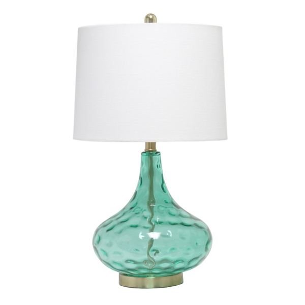 This Seafoam Dimpled Glass Teardrop Table Lamp will brighten up your space with light and style. It makes a wonderful addition to your entryway or bedside! Lamp measures 24H in. Crafted of glass Translucent teal finish with gold accents Dimpled teardrop base Hardback drum shade in white fabric Shade measures 14 in. in diameter Socket accommodates a 150-watt bulb 3-way switch Features a clear, plug-in cord Care: Dust with a soft, dry cloth. Do not exceed specified wattage. This item is available at Kirklands.com only, not available in stores. Please note: this item cannot be shipped to APO/FPO addresses.