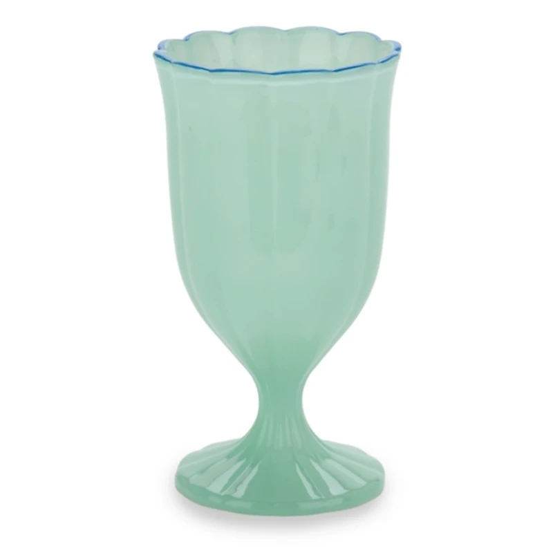 Our Seafoam Glass Scalloped Wine Glass will awaken your tablescape with delicate, coastal allure. The translucent green finish and blue accented rim add a subtle pop of color, while the softly scalloped details mimic the movement of ocean waves. Glass measures 3.25L x 3.5W x 6.3H in. Holds up to 11.5 oz. Crafted of glass Seafoam finish Scalloped edge Blue finished rim Food safe Care: Hand wash only. Not safe for microwave use. Contact your local Kirkland's store for availability. Quantities and selection may vary by location.