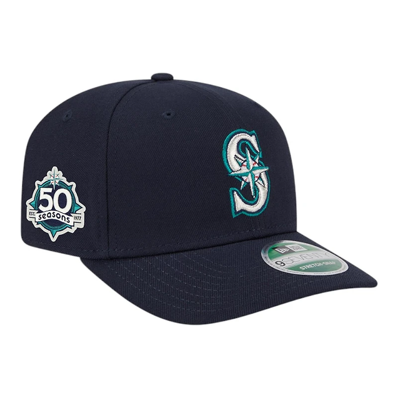 Show support for your favorite MLB team in this Seattle Mariners Navy 50 Seasons Patch New Era 9SEVENTY Stretch-Snap Adjustable Hat. It features an embroidered team logo on the front, New Era logo on the side, and adjustable snapback enclosure on the back. Celebrate a milestone in Mariners history with a New Era hat featuring the official 50 Seasons patch, honoring the franchise’s 50th season in 2026. This commemorative logo pays tribute to generations of fans. It is made by New Era and has a heat pressed side patch.New Era 9SEVENTY Stretch Snap HatComfortable stretch fit with modern styleSlightly curved visorAdjustable snapback closureOne size fits mostSlightly curved visorEmbroidered team logo and New Era logo