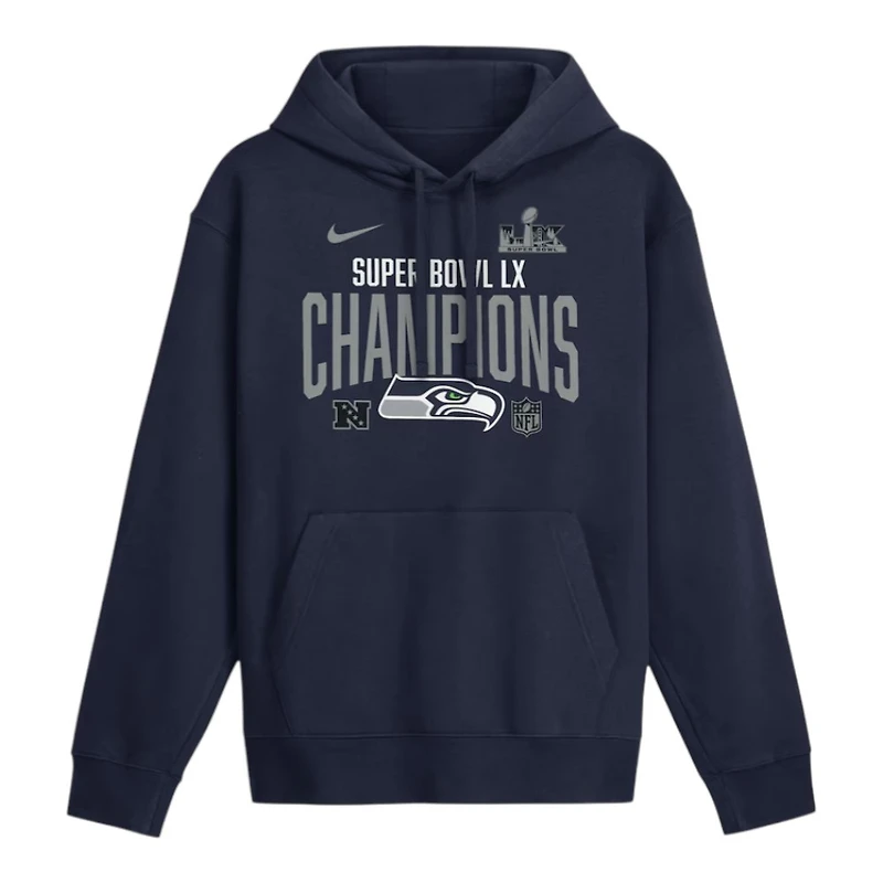 This Seattle Seahawks College Navy Super Bowl LX Champions Going Yard Nike Fleece Hoodie is made with soft, midweight fleece, this hoodie delivers all-day comfort and warmth whether you’re at the game or on the go. Front kangaroo pockets to keep the hands warm. It is officially licensed and made by Nike.