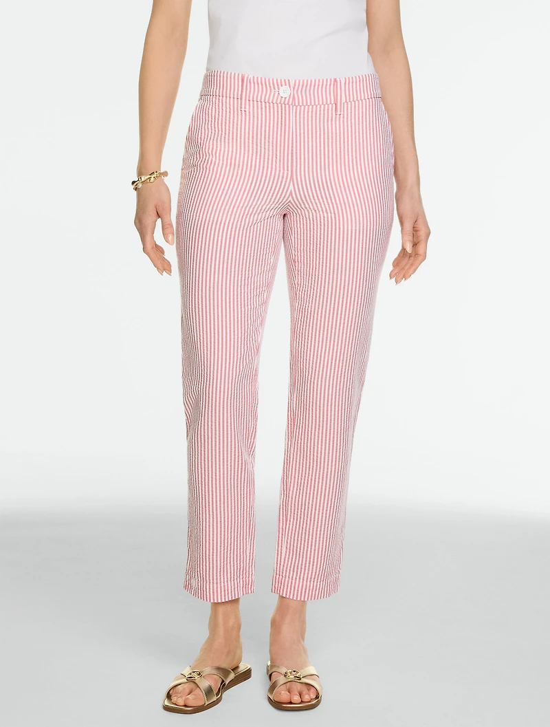 An effortless choice for a casual-chic ensemble! Classic seersucker adds polished texture to your favorite cropped slim leg pants. Looks great from desk to dinner. Dress them up or down. Also available in