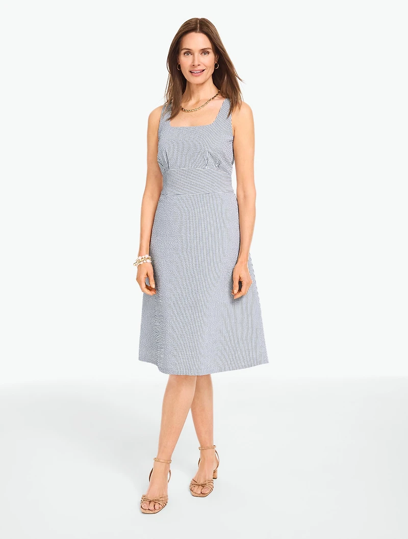 A timeless style with feminine details. Make an effortless statement in this beautifully crafted sleeveless dress. Crafted from crisp, lightweight seersucker in a fresh stripe print.