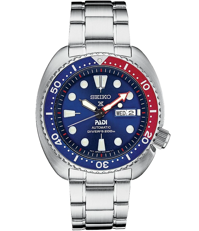 From Seiko, the Men's Prospex Automatic Diver Padi Special Edition Watch features: Automatic diver Stainless steel case and bracelet One-way rotating elapsed timing bezel LumiBrite hands and markers Manual and automatic winding capabilities Approx. 21,600 vibrations per hour Power reserve approx. 41 hours 24 jewels Day/Date calendar Screw down crown and case back Case diameter approx. 45.0mm Water Resistance: Up to 200 meters (660 feet) Diver's watch Follows ISO standards and is suitable for scuba diving Imported.