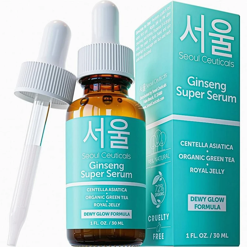Korean Skin Care Ginseng Super Serum. Benefits: THIS SUPERCHARGED cruelty free antioxidant serum drenches skin with hydration and delivers an array of beautifying, anti-aging benefits. Impressive, visible results accrue with regular use for a youthful, dewy glow. OUR PROMISE TO YOU - Deeply moisturizing, this Korean beauty Ginseng serum is guaranteed to minimize the appearance of fine lines & wrinkles and diminish rough texture for more even skin tone. EXTREMELY EFFECTIVE and deeply nourishing, this 98% natural & 72% organic K beauty hydrating serum contains Green Tea + Aloe + soothing Centella Asiatica (Cica) + water-binding Royal Jelly for maximum hydration. POTENT KOREAN SKIN CARE green tea serum increases skin elasticity & bolsters natural firmness. Our naturally derived Ginseng extract is rich in antioxidants to purify skin for a healthier, more luminous complexion. FOR NOTICEABLE RESULTS and major glow, this anti-wrinkle serum layers well under Korean makeup, Korean essence & with any multi-step K Beauty routine. Fragrance free & vegan friendly for all skin types. Key Ingredients: Korean Ginseng Root Extract - The ultimate skin energizer! This anti-aging powerhouse revitalizes, boosts circulation, and brings a youthful glow back to your complexion. Centella Asiatica - Known for its healing properties, it supports skin regeneration and reduces irritation. Green Tea Extract - Rich in antioxidants, it soothes, calms, and protects the under-eye area from environmental stressors. Royal Jelly - Rich in proteins, lipids, and vitamins, royal jelly deeply hydrates the skin, leaving it soft and supple. Formulated Without: Parabens. Sulfates. Phthalates.