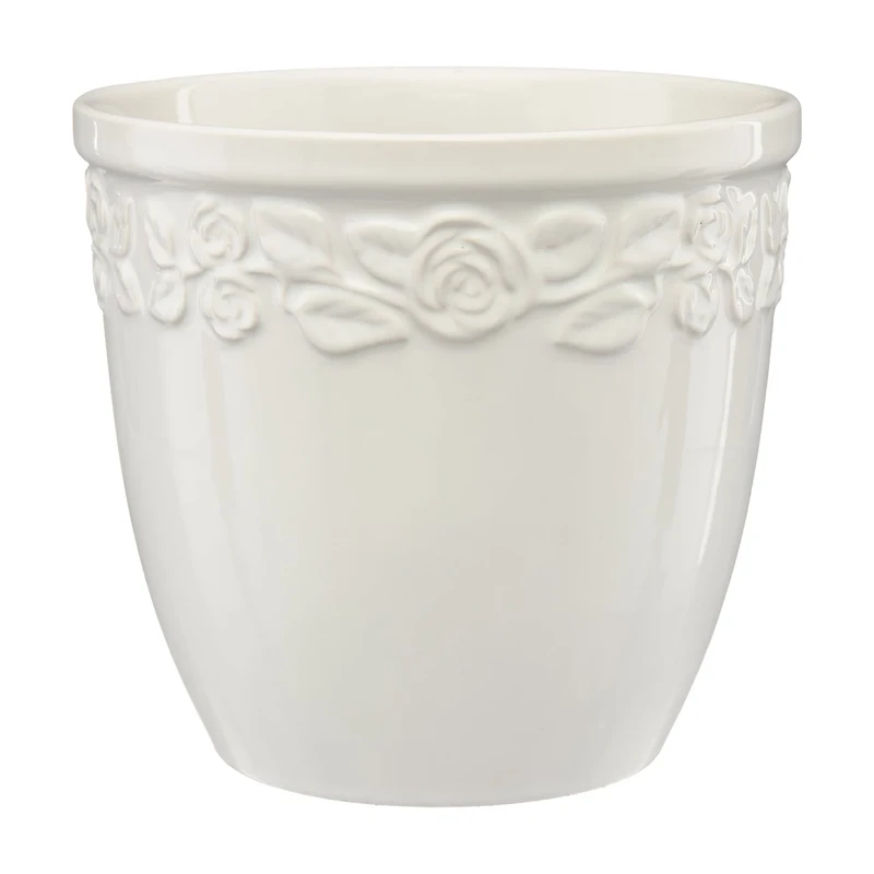 Crafted with high-quality ceramic, the Serena Garden Planter features a beautiful glossy white finish that adds a sleek and modern look to your plant display. The planter is adorned with an intricate embossed floral pattern around the rim, showcasing delicate roses and leaves that provide a timeless, classic appeal.