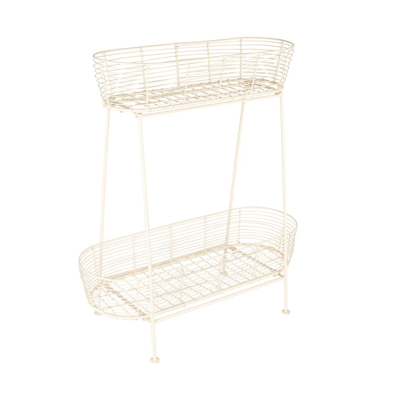 This Cream Serenity Metal Wire Plant Stand is a delightful way to elevate any plant display. The two-tier design, measuring 27 inches long, 12.5 inches wide, and 30 inches high, allows for ample space to arrange varied flora. The large basket, at 27 inches wide, 9.5 inches deep, and 5 inches high, and the smaller basket, at 23 inches wide, 8.5 inches deep, and 5 inches high, offer varied levels to create a dynamic visual. The cream color of the metal wire frame brings a light, fresh look to any setting, while the included hardware ensures stability and ease of assembly. Whether placed in a cozy corner or as a standout piece on the patio, this plant stand is a testament to tasteful living. An airy, cream-colored metal wire 2-tier plant stand that combines elegance with functionality, perfect for showcasing varied greenery. A charming addition to any indoor or outdoor space, this stand's neutral tone and graceful lines enhance the natural beauty of any plants. Ideal for displaying a variety of plants and flowers, this stand fits comfortably in small spaces or as a centerpiece in larger areas. Made of sturdy metal, this plant stand is designed to hold up to the elements while providing a stylish stage for any plants. 27” L x 12.5” W x 30” H.