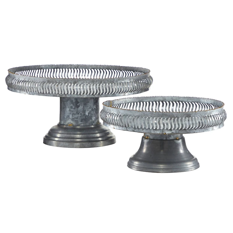 This galvanized metal cake stand set will make an excellent display pedestal for any decor in your home. A versatile piece for serving hors d'oeuvre or as a decorative display in your kitchen or living room. A great storage unit to display your decor and memorabilia in a compact friendly setting. This item comes shipped in one carton. Please note that this item is for decorative purpose use only and are not food safe. Suitable for indoor use only. Made in India. Set of 2 metal cake stands. Farmhouse-themed style.