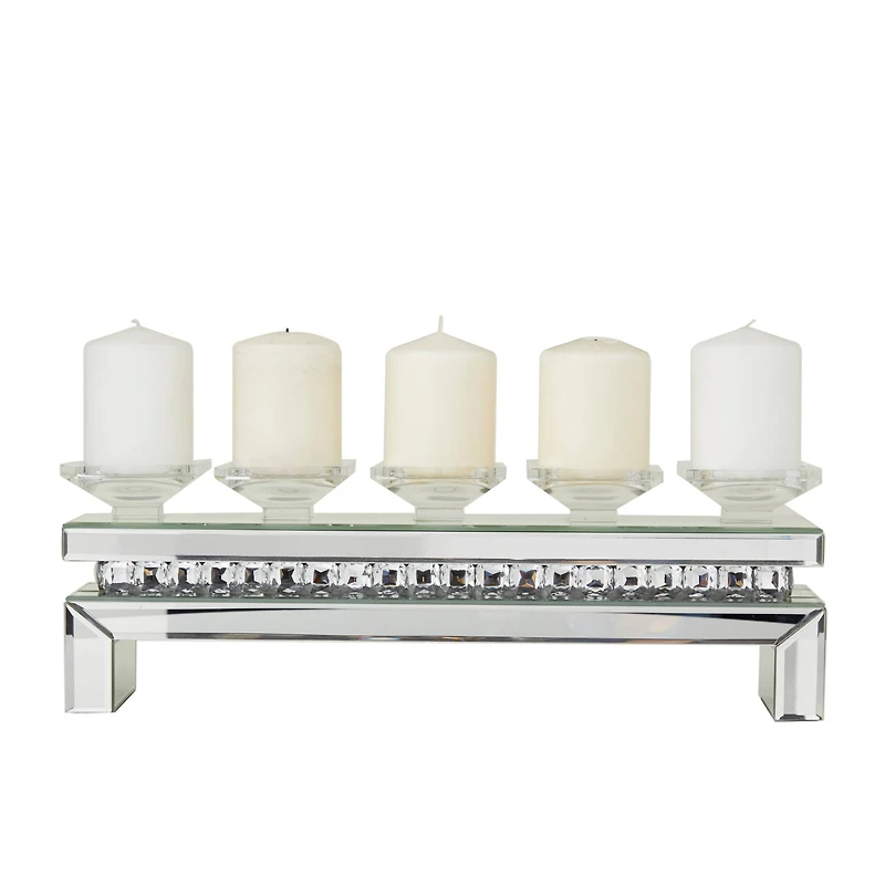 Infuse your space in the romantic candlelight glow that emits from this silver candle holder for home. Delight your guests and make any occasion extra special by adding a lighted or flameless candle to this candle holder centerpiece. A sturdy and long lasting construction that for a long lasting display. This glass and wood candle holder can accommodate up to 5 votive or pillar candles. This item comes shipped in one carton. The wood structure is encased in eye-catching reflective glass panels for a dazzling look. Suitable for indoor use only. Glam inspired.