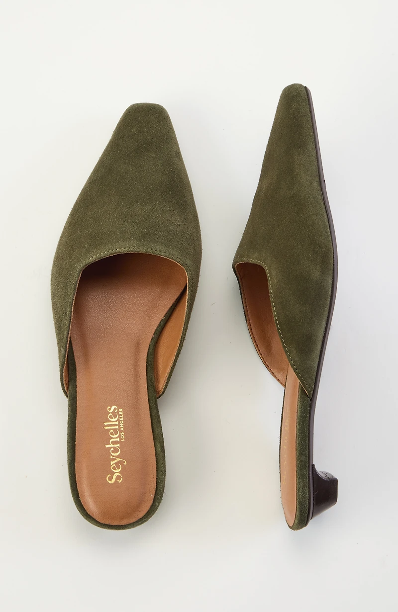 These slip-on mules are made in a soft suede with an elevated pointed-toe design and kitten heel for a chic, minimalistic appeal.