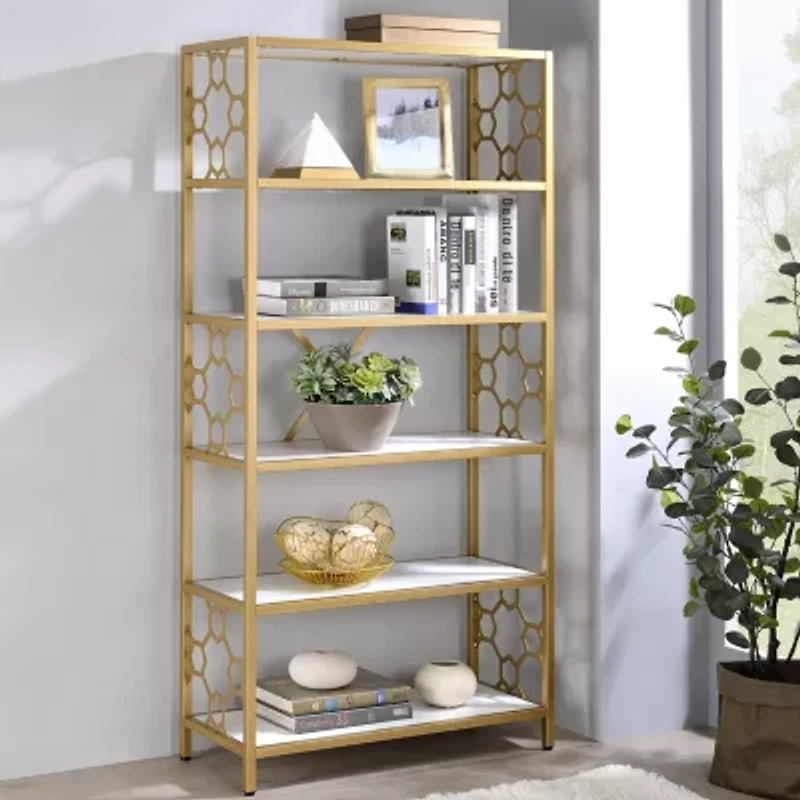 Your living room or home office is bound to feel a bit glamorous with this white bookcase. Made from steel, beautiful geometric designs on the frame make a stylish statement. This is a 5-shelf bookcase that is equipped to handle your book collection along with various decor items. With its open back design, it conveniently functions as a room divider.
