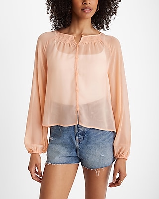 Sheer Smocked Balloon Sleeve Button Up Shirt in Chattanooga, TN