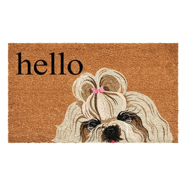Let your pet greet guests as soon as they reach the front door with this Shih Tzu Coir Doormat! With its long lashes and pink bow, this adorable puppy adds personality to your outdoor décor. Doormat measures 36L x 24W in. Crafted of coir Features a shih tzu design Accented with the text "hello" Hues of tan, black, and cream Vinyl back Care: Vacuum or sweep. This item is available at Kirklands.com only, not available in stores. Please note: this item cannot be shipped to APO/FPO addresses.