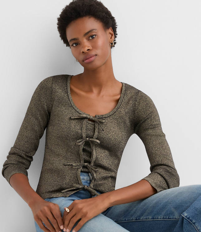 Tied with four adjustable bows and dusted in shimmer, this soft knit cardigan knows how to tie it all together - in the most charming way. Scoop neck Long sleeves, Bullet1: Sweater weight Lightweight, Hit: Cropped, Imported:, Fit: Relaxed an easy shape that's just shy of loose, Length: 20 1/2"long, Fabrication: 100% Cotton, Garment Care: Machine Washable Loft Shimmer Bow Cardigan Sweater Size XS Black Women's by Loft Size Regular - XS Black Women's Scoop, Neck Long Sleeve Cardigan Sweaters Dressy 100% Cotton Machine Washable Best Fall Sweaters