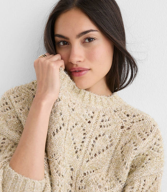 Sprinkled with shimmer and the prettiest pointelle stitch, this blouson - sleeved style delivers effortlessly statement - making flair. Crew neck Long sleeves, Bullet1: Sweater weight Midweight, Hit: Hits at waist, Imported:, Fit: Relaxed an easy shape that's just shy of loose, Length: 22"long, Fabrication: Body 52% Polyester 37 Acrylic 7 Metallic 4 Wool, Trimming: 51% Polyester 35 Acrylic 8 Metallic 3 Wool 2 Other Fiber 1% Spandex, Garment Care: Hand Wash Loft Shimmer Pointelle Blouson Sweater Size Medium Gold Sparkle Women's by Loft Size Regular - M Gold Sparkle Women's Wool, Blend Crew Neck Long Sleeve Pullover Sweaters Other Body: 52% Polyester 37% Acrylic 7% Metallic 4% Wool Trimming: 51% Polyester 35% Acrylic 8% Metallic 3% Wool 2% Other Fiber 1% Spandex Hand Wash Best Fall Sweaters
