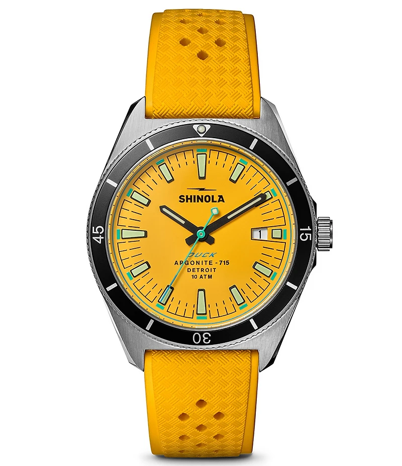 From SHINOLA, this watch features: Canary yellow dial Stainless steel case Unidirectional bezel Flat sapphire crystal C3 SuperLumi-Nova details on dial and hands Approx. 40mm case size Duck etched caseback plate with laser-etched serial number Screw-down crown Argonite 715 quartz analog movement Double-domed sapphire crystal Yellow basket weave texture rubber strap Buckle closure 10 ATM Swiss and imported parts Imported.