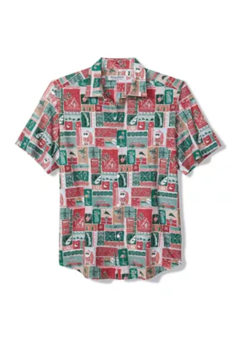 A coastal-inspired gift wrap print adds nautical festivity to this button-down shirt from Tommy Bahama®. Button closure Straight collar Short sleeves Imported Material & Care Polyester, spandex Machine washable