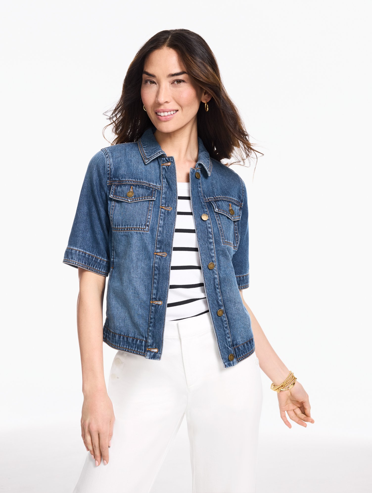 A go-to staple for warm weather. Instantly refresh your favorite outfits with this versatile short sleeve jean jacket. Made in a relaxed fit with patch front pockets. Hits above the hip.