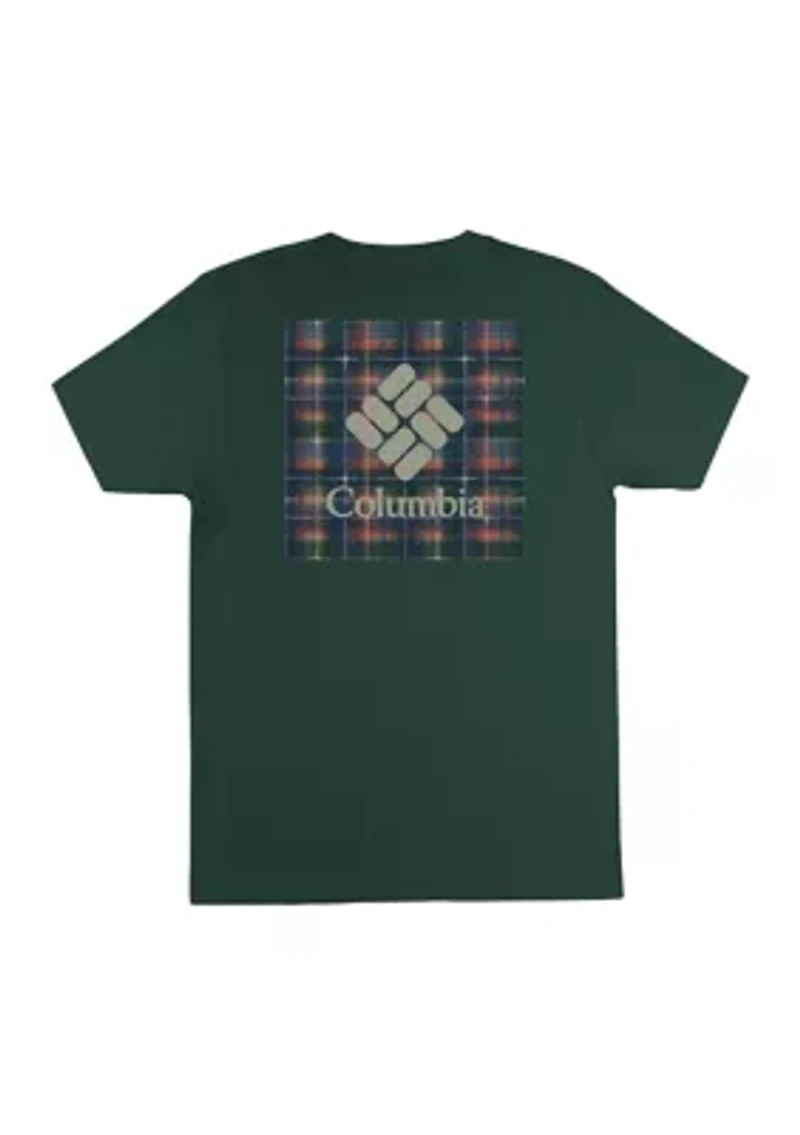 A classic Columbia logo dons a plaid backdrop on this t-shirt. Pullover Crew neck Short sleeves Imported Material & Care Cotton Machine washable