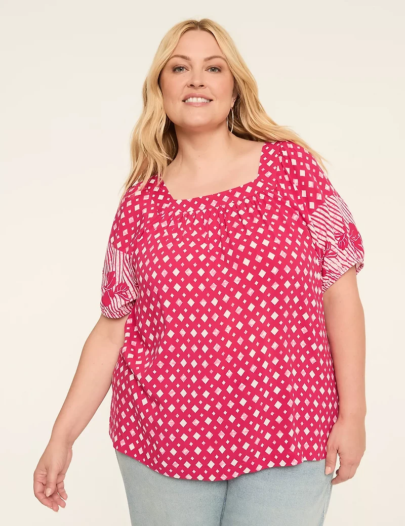 Available in Plus Size Bright days (and prints!) ahead. This blouse comes with pretty hues, a statement neckline and dress up or down possibilities. FIT: Classic. Designed for curves and a not-too-tight, not-too-loose, just-right fit. Front Length (On Body): 29.5" Standard length FEATURES: Square neck Short sleeves with covered elastic cuffs FABRIC: Soft, smooth fabric Machine Wash Cold With Like Colors; Only Non-Chlorine Bleach When Needed; Reshape And Line Dry; Cool Iron If Needed 100% Viscose Item Number #414365 Imported Plus Size Top ". Plus Size Short-Sleeve Square-Neck Blouse, in Pink Geo Print, 14/16, Women's, Lane Bryant