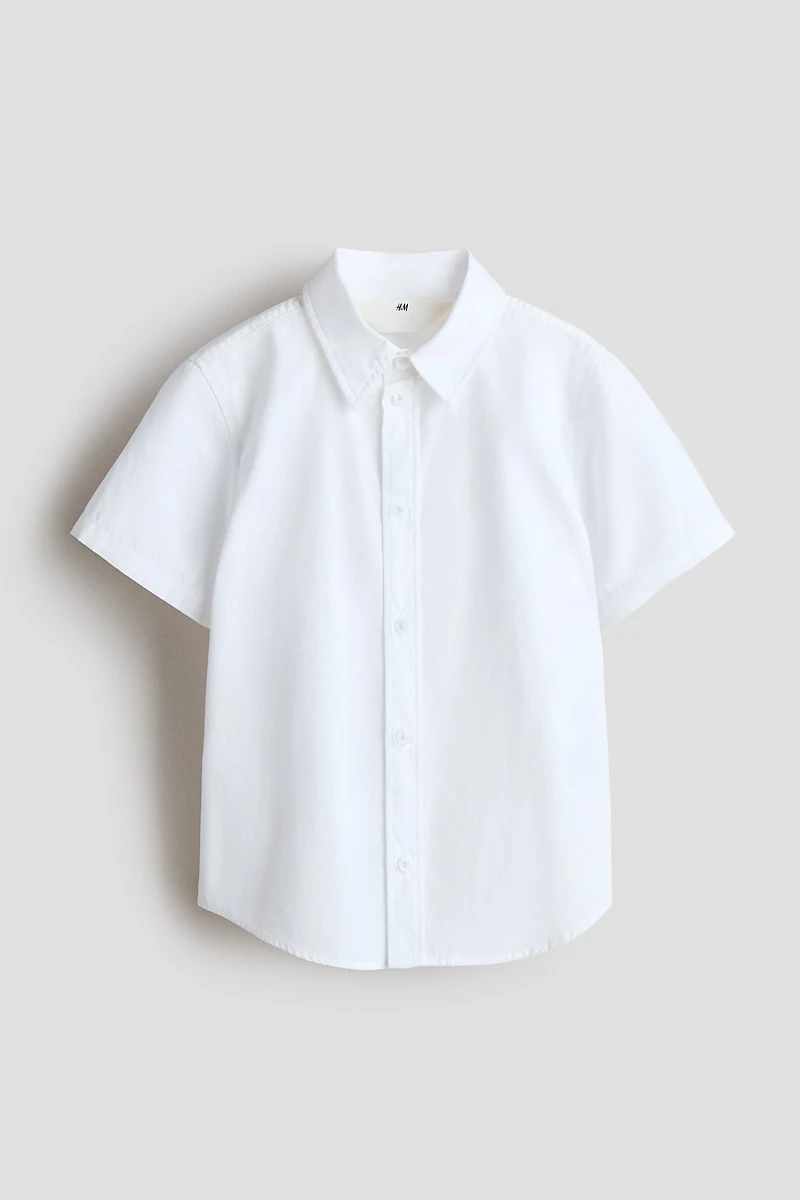 Short-sleeved shirt in airy cotton poplin. Classic collar, buttons at front, and yoke at back. Rounded hem.