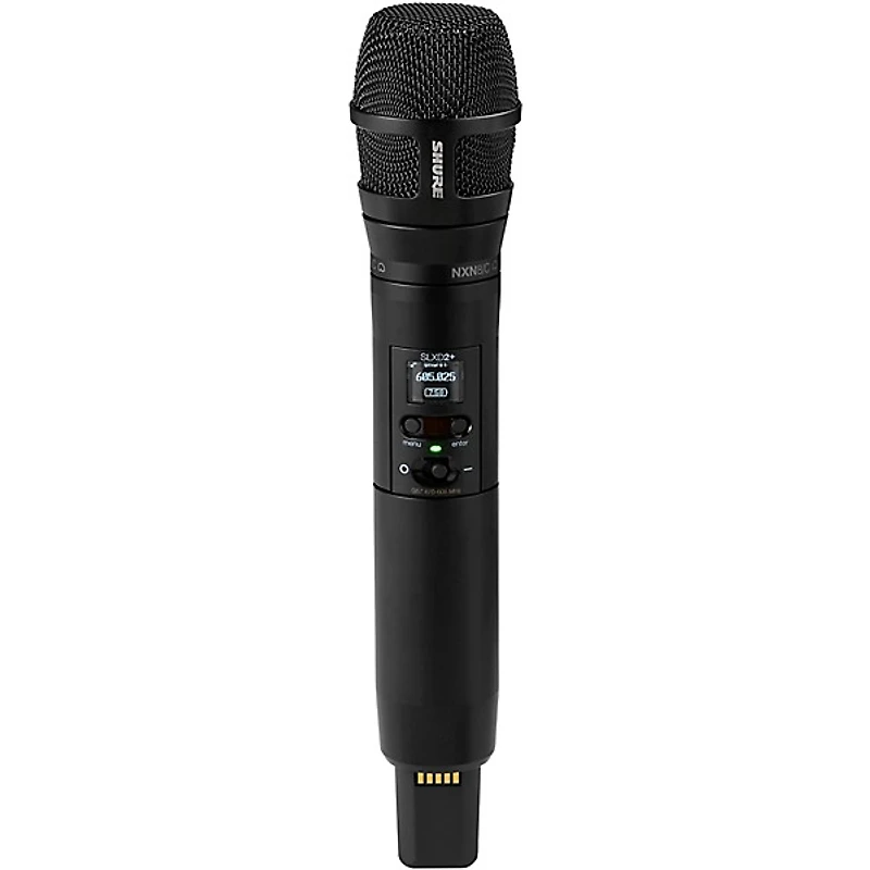Shure SLXD2+/N8C wireless handheld microphone transmitter pairs a Nexadyne 8/C cardioid dynamic capsule with 24-bit digital audio and Bluetooth monitoring.
